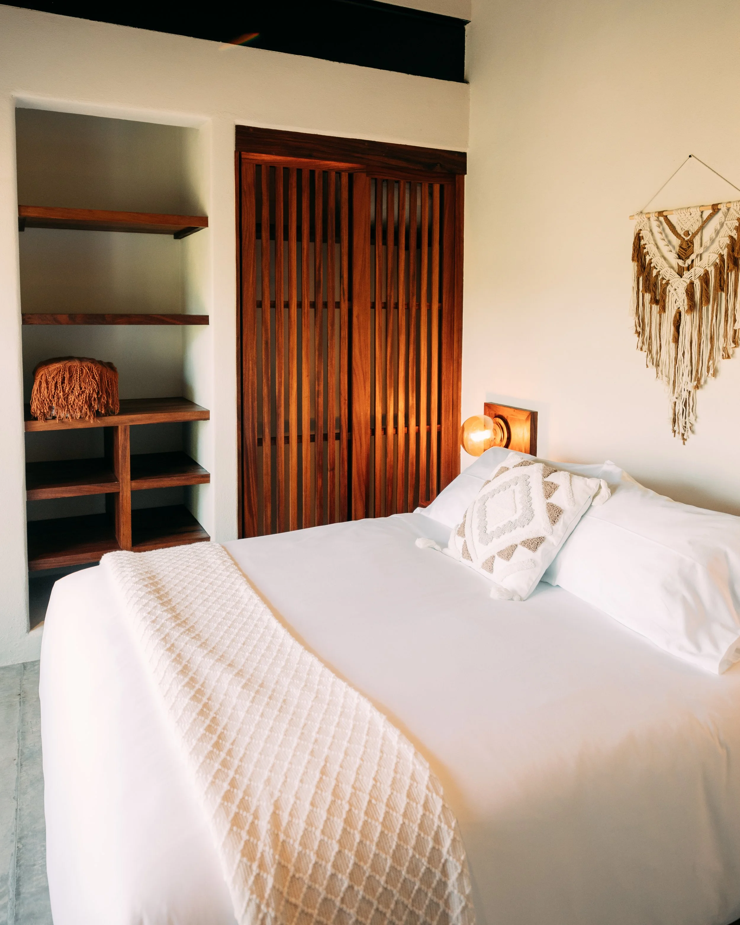 Warm, textural, and thoughtfully designed, this flexible space features two cozy queen beds and a twin bunk, ideal for friends, or solo travelers sharing accommodations.